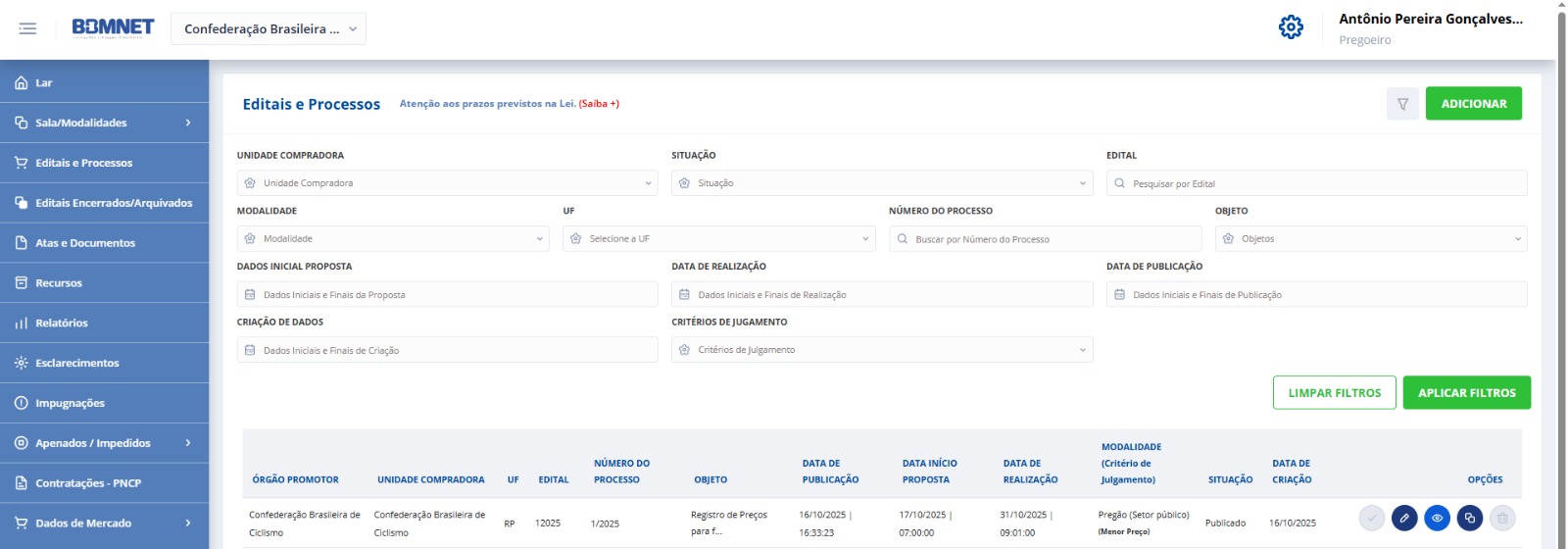 | OBJETO: | A CBC comunica que publicou na data de 16/10/2025 na BBMnet (www.novobbmnet.com.br) o Edital 001/2025 na modalidade modalidade PREGÃO, para REGISTRO DE PREÇOS, na forma ELETRÔNICA, pelo MENOR PREÇO GLOBAL POR TAXA DE TRANSAÇÃO para futura e eventual contratação de agência de viagens para prestação de serviços de emissão nacionais e internacionais de passagens aéreas e rodoviárias, serviços de hospedagem, transporte terrestre através de locação de veículos, ônibus ou outros para deslocamento de atletas, funcionários entre outros indicados, seguro viagem e serviços conexos incluindo locação de bens, alimentação, locação de espaços físicos e demais destinados à realização de eventos esportivos, congressos ou outros, para atendimento a Confederação Brasileira de Ciclismo – CBC, conforme descrição no presente EDITAL e seus Anexos. |