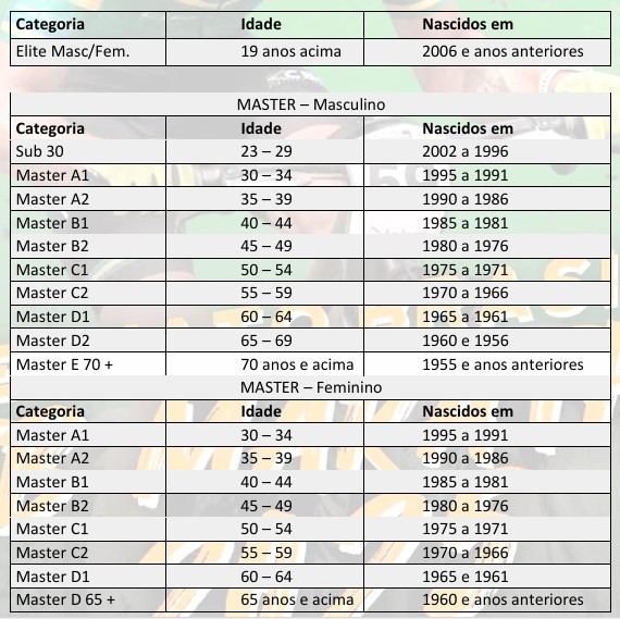 • Categorias oficiais do CAMPEONATO BRASILEIRO DE MOUNTAIN BIKE MARATHON 2025, são as seguintes: