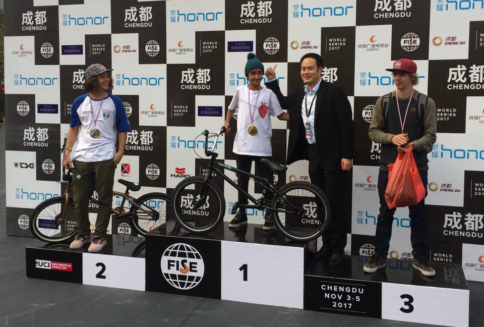 Mais conhecido como ”bala loka”, devido sua agilidade e eficiência na realização das manobras, Gustavo de Oliveira, de apenas 15 anos, fez bonito em Chengdu, na China, durante etapa do Fise World Series, válida como etapa final da Copa do Mundo de BMX Freestyle Park 2017, e garantiu o título para o Brasil na categoria Amador.