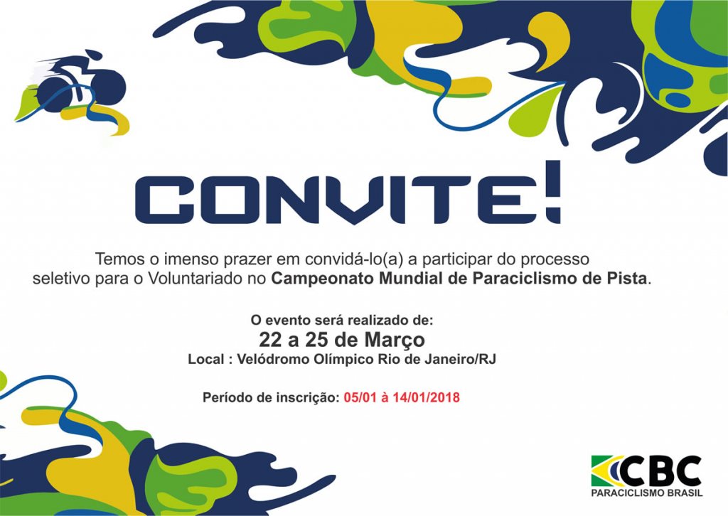 O processo de inscrição para atuar como voluntário do Campeonato Mundial de Paraciclismo de Pista 2018 começa nesta sexta-feira (05/01) e se estende até o próximo dia 15 de janeiro. A competição acontece entre os dias 22 e 25 de março, no Velódromo Olímpico do Rio de Janeiro (RJ).