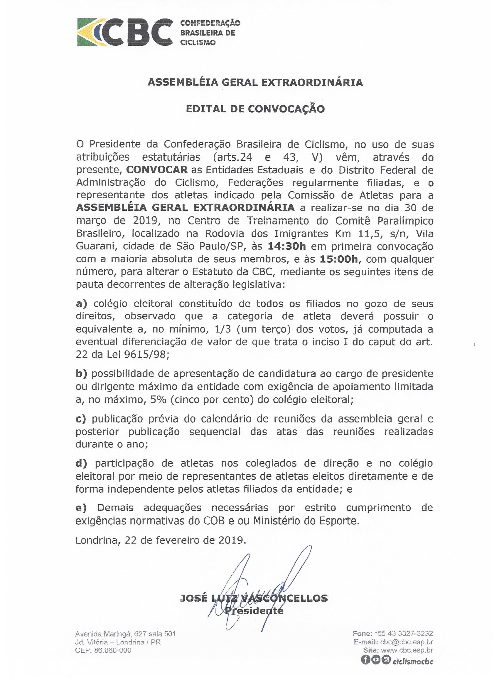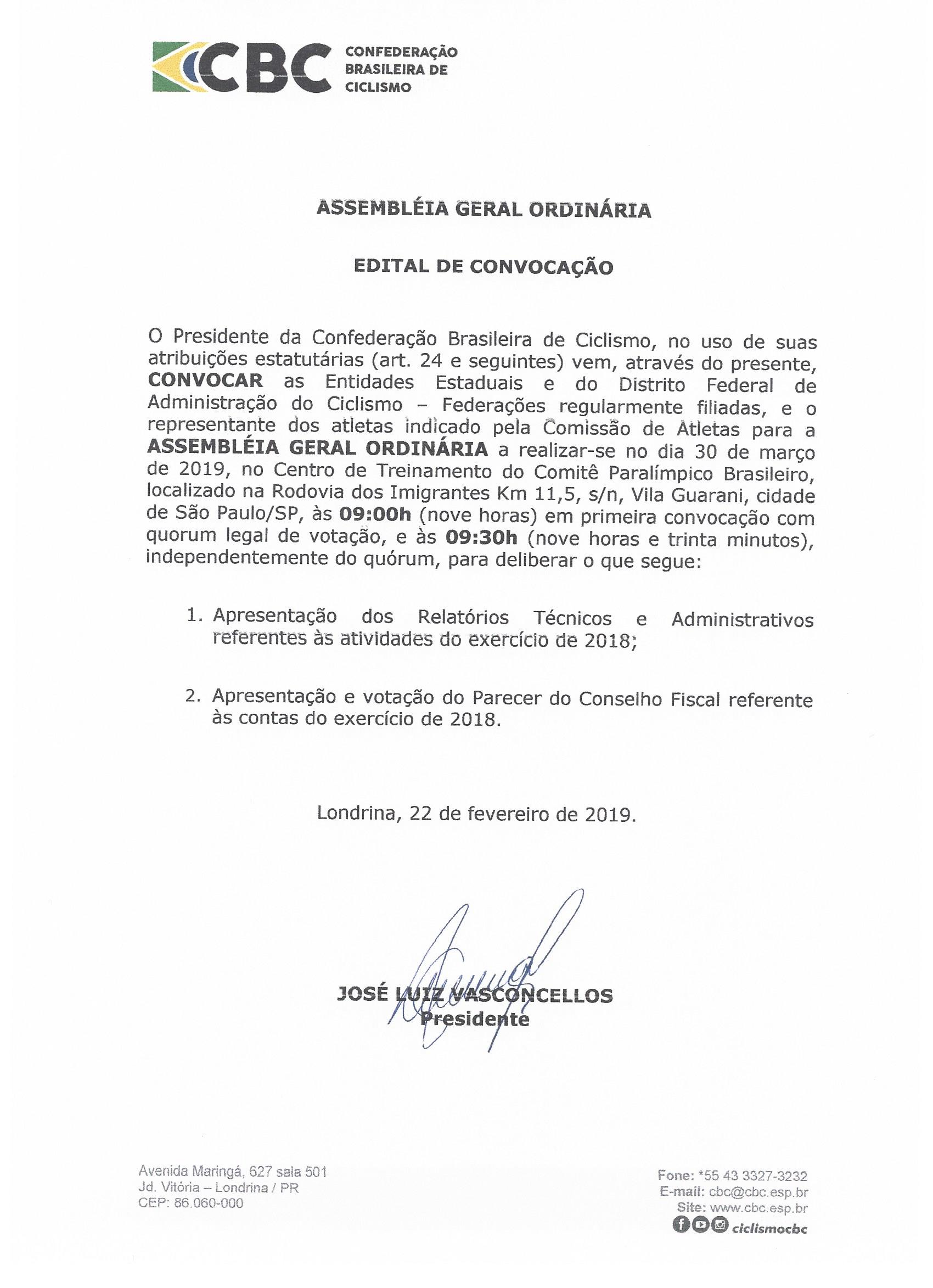 A Confederação Brasileira de Ciclismo (CBC), vem através deste comunicado, informar a publicação, dos editais de convocação para a Assembléia Geral Ordinária (AGO) e Assembléia Geral Extraordinária (AGEX), que serão realizadas no dia 30 de março de 2019 às 09h00 e 14h30, respectivamente. As assembléias acontecerão no Centro de Treinamento do Comitê Paralímpico Brasileiro, localizado na rodovia dos Imigrantes Km 11,5, s/n, Vila Guarani, cidade de São Paulo/SP.