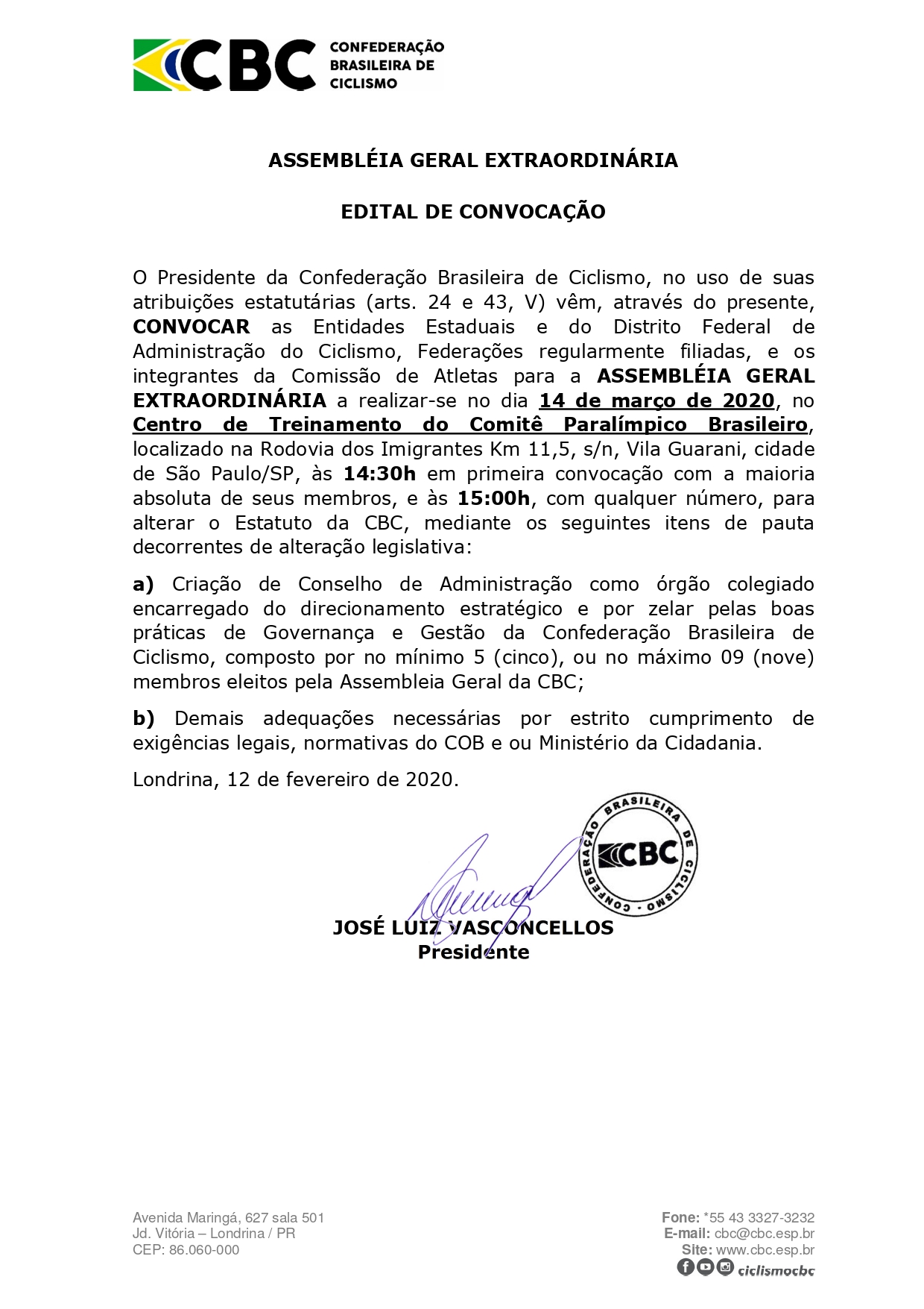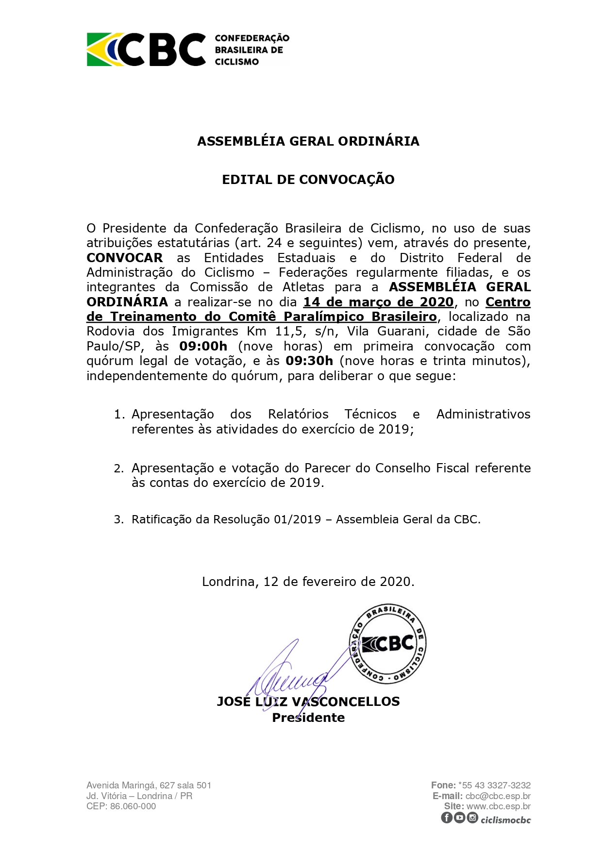 A Confederação Brasileira de Ciclismo (CBC), vem através deste comunicado, informar a publicação, dos editais de convocação para a Assembléia Geral Ordinária (AGO) e Assembléia Geral Extraordinária (AGEX), que serão realizadas no dia 14 de março de 2020 às 09h00 e 14h30, respectivamente. As assembléias acontecerão no Centro de Treinamento do Comitê Paralímpico Brasileiro, localizado na rodovia dos Imigrantes Km 11,5, s/n, Vila Guarani, cidade de São Paulo/SP.