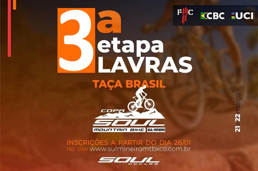 A terceira etapa da Taça Brasil, que também será Copa Soul Mountain Bike Sul Mineiro promete agitar o Sul de Minas. O campeonato, que reúne grandes nomes da modalidade, acontecerá na cidade mineira de Lavras entre os dias 21 e 22 de março. Os primeiros colocados, além de somarem pontos para o Ranking Nacional, também pontuam no ranking internacional classificatório para as Olímpiadas de Tóquio.