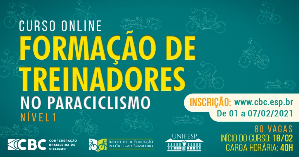 A Confederação Brasileira de Ciclismo (CBC), através do Instituto de Educação do Ciclismo Brasileiro, anuncia a abertura da segunda turma do Curso de Formação de Treinadores do Paraciclismo Nível I. O curso, mais uma vez terá inscrições gratuitas, e os interessados podem se inscrever a partir da próxima segunda-feira (1º) até o dia 07 de fevereiro no site da confederação: http://www.cbc.esp.br/.