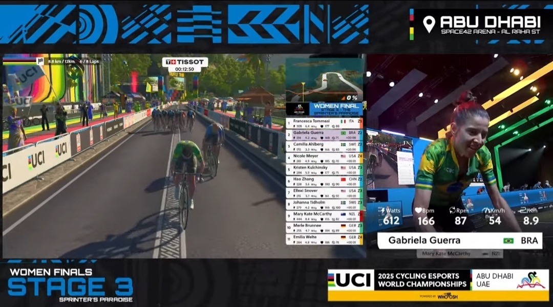 A brasileira Gabriela Guerra voltou a brilhar no cenário internacional ao conquistar, neste sábado, 15 de novembro, a medalha de prata no Campeonato Mundial UCI de Ciclismo eSports 2025, realizado em Abu Dhabi (Emirados Árabes Unidos). A atleta repetiu o feito de 2024 e se tornou vice-campeã mundial pelo segundo ano consecutivo, consolidando sua presença entre as principais referências do ciclismo virtual na atualidade.
