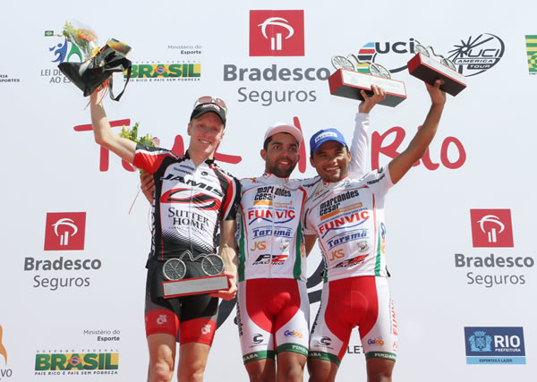 Pódio da quarta etapa - Foto: Fotocom.net O Brasil fez dobradinha no pódio da mais longa e difícil etapa do Tour do Rio 2011: os 193km de serra entre Teresópolis e Rio das Ostras. Magno Nazaret e Antônio Nascimento, companheiros na equipe FUNVIC/Pindamonhangaba, foram os dois primeiros, seguidos pelo americano Tyler Wiren (Jamis Sutter Home Pro Cycling). Nazaret, campeão brasileiro na modalidade Contra o Relógio em 2011, cumpriu o trecho em 4h41min15s. Nascimento e Wiren marcaram 4h41min25s. A velocidade média foi 41,1km/h.“Foi a corrida mais difícil do ano. Teve horas na prova em que pensei em desistir. A dois quilômetros da chegada, estava esgotado e sem forças, quase diminuí o ritmo. Mas o povo na rua me incentivou e me levou ao final”, disse Nazaret. “A equipe trabalhou forte para que o Tonho levasse as metas de montanha. Quando faltava 20km para o final, resolvi partir do pelotão e avançar”, completou.Antônio “Tonho” Nascimento venceu os dois prêmios de montanha intermediários durante o trecho e recuperou a camisa branca de bolas vermelhas de melhor montanhista da competição, desbancando o favoritismo dos colombianos. O brasileiro Renat Seabra (Dataro/Foz do Iguaçu), que vestiu a camisa nesta etapa, se acidentou em uma das curvas da estrada Mury-Lumiar e passará a noite no hospital para avaliar a lesão no quadril.“É uma honra vestir essa camisa. O Tour do Rio é um evento maravilhoso, muito bem organizado e com atletas fortes. Ser o Rei da Montanha é especial”, disse Tonho, que ficará em definitivo com o titulo simbólico já que na última etapa, toda plana, não há metas de montanha a serem alcançadas. Tonho é o brasileiro mais bem colocado no ranking geral, em quinto lugar.O argentino Edgardo Simon (Padaria Real/Sorocaba) continua com a camisa verde de melhor velocista, enquanto o colombiano Juan Suarez (EPM Colômbia) segue liderando a competição na classificação geral e largará para a última etapa com a camisa amarela.A arena do Tour do Rio foi montada na Lagoa de Iriri e levou um grande público ao local neste sábado de sol. Ciclistas mirins, acompanhados de seus pais, deram tratamento de ídolo aos atletas, que não se cansaram de posar para fotos e dar autógrafos. No Adeus Rodinhas, o projeto de iniciação ao ciclismo promovido pelo Tour do Rio, centenas de crianças de cinco a 12 anos participaram das oficinas.A quinta e última etapa do Tour do Rio 2011 terá 183,9km entre Rio das Ostras e a Quinta da Boa Vista/RJ, passando pela ponte Rio-Niterói. A largada em Rio das Ostras será às 7:00, com chegada prevista na Zona Norte do Rio às 11h. A partir das 9h haverá no local o Adeus Rodinhas.RESULTADOS – TOUR DO RIO:Quarta etapa / Teresópolis-Rio das Ostras / 193km / 41,17km/h1. Magno Nazaret (FUNVIC/Pindamonhangaba / BRA) - 4h41min15s2. Antonio Nascimento (FUNVIC/Pindamonhangaba / BRA) – 4h41min25s3. Tyler Wren (Jamis Sutter Home Pro Cycling / EUA) – 4h41min25s4. Jaime Castaneda (EPM UNE Colômbia / COL) – 4h41min25s5. Javier Gomez (EPM UNE Colômbia / COL) – 4h41min25s6. Juan Suarez (EPM UNE Colômbia / COL) – 4h41min25s7. Flavio Reblin (Memorial/Santos / BRA) - 4h41min25s8. Ibon Zugasti (MMR Spiuk Start Cycling / ESP) – 4h41min25s9. Josep Constantino (MMR Spiuk Start Cycling / ESP) – 4h41min25s10. Adélio Silva (FUNVIC/Pindamonhangaba / BRA) – 4h41min25sClassificação geral após quatro etapas:1. Juan Suarez (COL / EPM UNE Colômbia)2. Jaime Castaneda (COL / EPM Colômbia)3. Edward Beltran (COL / EPM UNE Colômbia)4. Javier Gomez (COL / EPM UNE Colômbia)5. Antonio Nascimento (BRA / FUNVIC/Pindamonhangaba)Classificação geral de montanha após quatro etapas:1. Antonio Nascimento (BRA / FUNVIC/Pindamonhangaba), 26 pontos2. Ibon Zugasti (ESP / MMR Spiuk Start Cycling), 12 pontos3. Juan Suarez (COL / EPM UNE Colômbia), 10 pontosClassificação geral de velocidade (sprint) após quatro etapas:1. Edgardo Simon (ARG / Padaria Real/Caloi/Céu Azul/Sorocaba), 24 pontos2. Rafael Andriato (BRA / Petroli Firenze), 19 pontos3. Jaime Castaneda (COL / EPM UNE Colômbia), 15 pontos