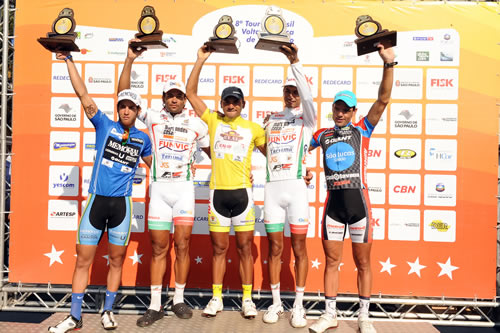 Os cinco melhores. Crédito: Sérgio Shibuya José Eriberto, de Sorocaba, é o grande campeão do Tour do Brasil - Volta Ciclística Internacional do Estado de São Paulo 2011. O título, que já era quase certo desde Campos do Jordão, no sábado, veio com uma chegada em pelotão, que impossibilitou que Flávio Santos, o Baiano, da Funvic/Marcondes Cesar/Pindamonhangaba tirasse a vantagem de 42 segundos que pertencia a Eriberto. O time de Pindamonhangaba levou os títulos por equipes e por pontos, mas repetiu o vice do ano passado na individual, com Baiano.A curta etapa deste domingo, 55,5 quilômetros entre Jundiaí e São Paulo, foi vencida por Roberto Pinheiro, de Pindamonhangaba, que cruzou a linha após 1h06min37s de estrada. Apesar da terceira vitória de Betinho, Pindamonhangaba não conseguiu evitar que a chegada fosse em pelotão, sem diferença de tempo, o que garantiu o título de José Eriberto. "O Baiano atacou bastante nessa etapa, mas minha equipe trabalhou bem e conseguiu neutralizar todas as fugas. Devo muito a eles. É um sonho realizado!", contou o campeão, José Eriberto.Eriberto teve todo o apoio de sua equipe desde as primeiras etapas. Os atletas de Sorocaba sacrificaram os outros títulos do Tour em favor do ciclista de 26 anos, nascido em Natal (RN). "Deixamos o resto de lado e colocamos toda a equipe para trabalhar por um único objetivo, que era o título individual", revelou Edgardo Simon, técnico e atleta de Sorocaba, que foi o terceiro na etapa deste domingo, atrás de Roberto Pinheiro e de Daniel Rogelin, de São José. "Nós montamos uma equipe forte, tivemos bons resultados, mas estava faltando uma vitória. Nada podia ser melhor do que comemorar essa primeira vitória justamente aqui, no Tour do Brasil", desabafou Edgardo.José Eriberto, que já estava emocionado após a chegada, mal pôde se segurar em pé no pódio na hora da premiação, quando sua mãe apareceu e lhe entregou o troféu de campeão junto com o governador de São Paulo, Geraldo Alckmin. Dona Sebastiana veio de Natal, no Rio Grande do Norte, de surpresa, para a chegada do Tour. "Eu quase tive um ataque do coração quando vi minha mãe aqui. Eu tentei falar com ela por telefone ontem o dia todo e não consegui. Fazia cinco meses que nós não nos víamos". O curioso foi que a chegada de Dona Sebastiana despertou emoção até mesmo nos adversários de Eriberto. Betinho e Baiano cumprimentaram e se abraçaram com Dona Sebastiana, que eles conheceram quando Eriberto corria por Pindamonhangaba, no ano passado. Antes, entre 2003 e 2009, o ciclista defendeu a equipe de Assis.Pindamonhangaba vence por equipes -A Funvic/Pindamonhangaba não conseguiu o cobiçado título individual, mas levou o prêmio por pontos, com Betinho, e também o título geral por equipes. Betinho venceu três etapas neste Tour e garantiu o título por pontos com grande vantagem. O título por pontos conta a passagem pelas metas volantes e também as chegadas de cada etapa. Betinho terminou com 52 pontos, contra 31 do segundo colocado, o Baiano, também de Pindamonhangaba. Por equipes, o time do Vale do Paraíba venceu seis da oito etapas desta edição e colocou 7min59s sobre o segundo colocado, São Lucas Saúde/Giant/UAC/Americana. Sorocaba ficou somente com a terceira colocação, mais de 10 minutos atrás dos campeões. Além do título por equipes, por pontos, e de Baiano vice-campeão, Pindamonhangaba terminou o Tour também com o terceiro melhor ciclista, Tiago Fiorilli. "Nós fizemos um grande trabalho, não tem como eu não estar feliz. Ganhamos por equipes e por pontos e só não levamos o individual geral por um problema mecânico, que foi o furo do pneu do Baiano na segunda etapa", resumiu Benedito Tadeu, o Kid, técnico de Pindamonhangaba. Kid refere-se ao problema que seu atleta teve no final da segunda etapa e que permitiu que Eriberto escapasse sozinho e abrisse quase dois minutos de vantagem logo no começo do Tour.Mesmo sem levar o título, a equipe do técnico Kid virou uma espécie de referência de excelência no Tour. "A Funvic/Marcondes Cesar/Pindamonhangaba atualmente está entre as melhores equipes das Américas (lidera o ranking nacional e está em quarto no ranking do continente). Ganhar deles, com o Baiano na excelente forma em que está, é uma conquista que merece ser muito comemorada", destacou o técnico de Sorocaba Edgardo Simon. Diego Ares, campeão de montanha, também lembrou Pindamonhangaba ao comemorar seu título. "Ganhar aqui já era um sonho, e tem ainda mais valor quando o segundo colocado é Antonio Nascimento [de Pindamonhangaba] que vence na montanha praticamente todos os anos aqui no Tour e em todas as outras competições".Chancela internacional - O Tour do Brasil - Volta Ciclística Internacional do Estado de São Paulo é uma prova clássica do calendário Sul-Americano. Nesta edição, participaram 136 atletas de 20 equipes do Brasil (14), Argentina (2), Uruguai, Chile, Equador e Dinamarca. Depois de quase 900 quilômetros cronometrados nas oito etapas, chegaram a São Paulo 90 ciclistas. A União Ciclística Internacional (UCI), que é a entidade que rege o esporte no mundo, enviou três comissários para acompanhar a prova no Brasil: a portuguesa Paula Martins, o colombiano César Sanchez e o costa-riquenho Cristian Magarro, este último responsável exclusivamente pelo controle anti-dopagem.Resultados da oitava - Jundiaí / São Paulo - 55,5 km (cronometrados), média de 49.987 km /hIndividual1- Roberto Pinheiro (Funvic/Marcondes Cesar/Pindamonhangaba) - 1h06min37 (10 segundos de bonificação).2- Daniel Rogelin (São José dos Campos/Cannondale) - mesmo tempo (6 segundos de bonificação)3- Edgardo Simon (Padaria Real/Caloi/Céu Azul Alimentos/Sorocaba) - mesmo tempo (4 segundos de bonificação)4- Glauber Nascimento (Suzano/Trotz/Microshift) - mesmo tempo 5- Cristian Clavero (Avaí/Florianópolis/APGF) - mesmo tempo13- José Eriberto (Padaria Real/Caloi/Céu Azu