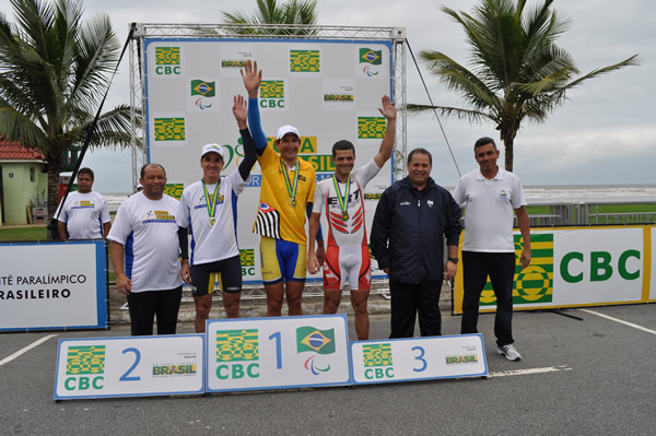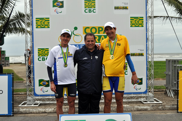 João Schwindt a esquerda, Edilson Rocha do CPB ao centro e Soelito Gohr a direitaCredito: CPB/DivulgaçãoOs principais atletas do Para-ciclismo brasileiro disputaram neste final de semana, entre os dias 22 e 24 de junho, da primeira etapa da Copa Brasil de Para-Ciclismo 2012. Os principais destaques da prova foram os atletas integrantes da seleção brasileira que dominaram a categoria C5.