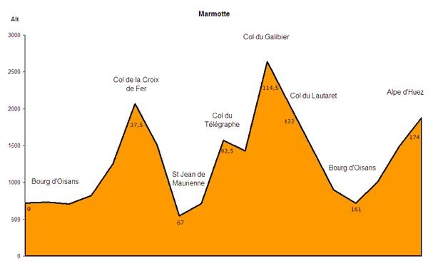 La Marmotte é a mais antiga, e considerada a mais dura Grandfondo do mundo. No total são 174 quilômetros percorridos entres as estradas dos Alpes franceses, destacando os mais de 100 quilômetros completamente montanhosos, compostos pelos míticos Col du Glandon (1.818m), Col du Telegraphe (1.570m), Col du Galibier (2.642m), Alpe d’Huez (1.880m) e Col du Lautaret (2.057m).