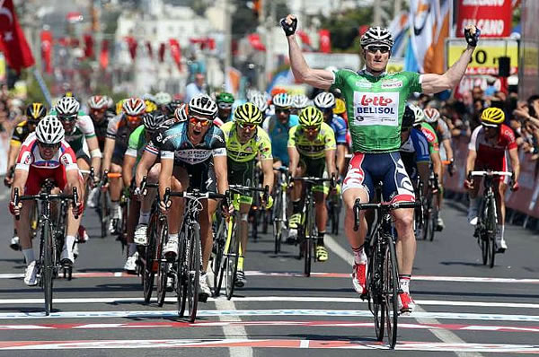 Chegada da quinta etapaCrédito: Biondi/BettiniphotoPreviousEm uma chegada emocionante, o brasileiro Rafael Andriato, que compete pela equipe italiana Fantini Vini/Selle Itália, conquistou a sexta colocação durante a quinta etapa da Volta Ciclística da Turquia. A vitória ficou com o ciclista alemão André Greipel (Lotto).