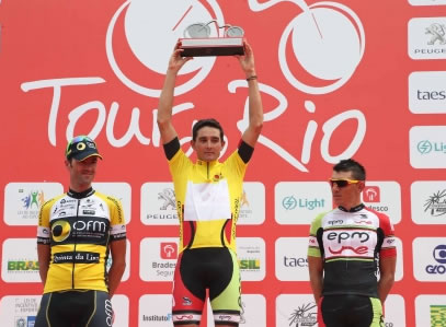 Pódio finalCrédito: DivulgaçãoO último dia do Tour do Rio 2013 foi de vitória brasileira, com Gregolry Panizo (Funvic Brasilinvest / São José dos Campos), pódio verde-amarelo e consagração de Óscar Sevilla (EPM-UNE – Colômbia) como grande campeão. O ciclista espanhol terminou a prova longe das primeiras colocações, mas foi rápido o suficiente para se manter como o líder no somatório dos tempos das cinco etapas do Tour e terminar com o título, simbolizado pela camisa amarela.