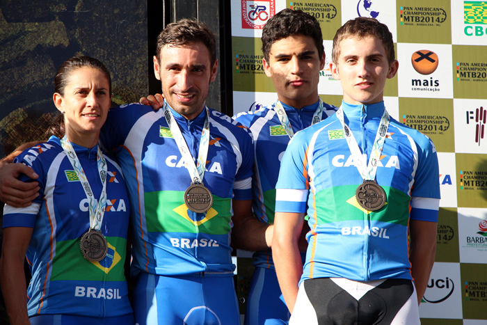 Team RelayCrédito: CBC/DivulgaçãoOs ciclistas que integraram a equipe brasileira durante a prova do Team Relay, que marcou o pontapé inicial do Campeonato Pan-Americano de Mountain Bike 2014, conquistaram a primeira medalha brasileira na competição ao terminarem com a medalha de bronze.