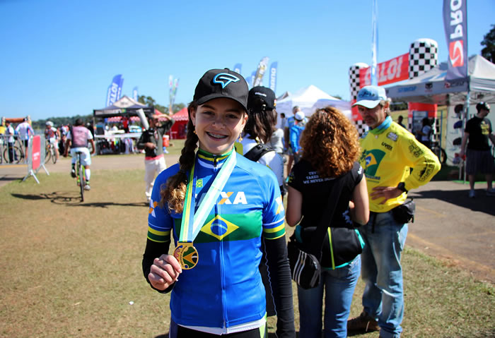 Bruna SaalfeldCrédito: Thiago Lemos/CBCBruna aceitou a bicicleta emprestada, superou o susto, deu a volta por cima e sagrou-se Campeã Brasileira de MTB XCO pela categoria infantojuvenil feminino. Após cruzar a linha de chegada, emocionada, a atleta afirmou que ficou surpresa pelo título, até pelo pouco tempo que teve para se adaptar com o novo equipamento.“Foi uma grande surpresa, uma baita superação eu ser campeã brasileira. Até porque é difícil se acostumar tão rápido com uma nova bicicleta. Existem vários detalhes para ajustar, mas acabou dando tudo certo. Eu não tenho nem palavras para descrever a alegria que estou sentindo. Gostaria de agradecer ao Sr. Sergio Galo, que me emprestou a bicicleta, minha família, e também os empresários de São Lorenço que me ajudaram a poder chegar até aqui”, destacou Bruna.ExperiênciaJá entre os atletas mais experientes do Campeonato Brasileiro, Abraão Azevedo (Miroir Esporte Clube) se destacou por chegar com quase três minutos de vantagem sobre o segundo colocado e comemorar o seu sétimo título nacional.Com 23 anos dedicado ao ciclismo, o atleta de Brasília elogiou toda a organização e comentou a importância do crescimento da modalidade, com tantos atletas largando nas categorias de base.