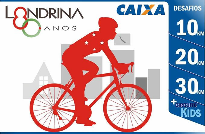 Londrina se prepara para a primeira Pedalada Caixa Cidade de Londrina em comemoração aos 80 anos da cidade, no próximo dia 14, às 8 horas, nas proximidades das avenidas Maringá e Ayrton Senna. Aberto a comunidade, o evento deve reunir cerca de 700 participantes, entre adultos e crianças. Para o público infantil será montado um Circuíto Kids no aterro. Já os adultos poderão escolher percursos que serão divididos da seguinte forma: 10 km, 20 km e 30 km. Para o desafio de 10 km, será realizada uma volta completa no percurso. Para os desafios de 20 km e 30 km, serão realizadas, respectivamente, duas e três voltadas completas no percurso com passagem obrigatória pela linha de largada/chegada.