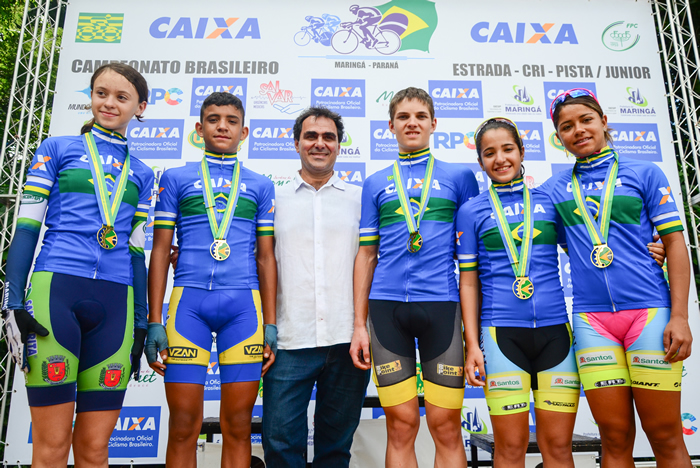 Pódio da categoria JuniorCrédito: Luis Claudio/CBC Os ciclistas paulistas Vitor Gonçalves, que defende a equipe catarinense Hidrorepell Tintas/FME/Bike Point, e Thayná Araujo, da Memorial/Santos, venceram neste domingo, 24 de maio, a prova de resistência do Campeonato Brasileiro de Ciclismo de Estrada Junior 2015. A prova aconteceu em Maringá, no Paraná, e reuniu os melhores atletas do Brasil com idade entre 12 e 18 anos.