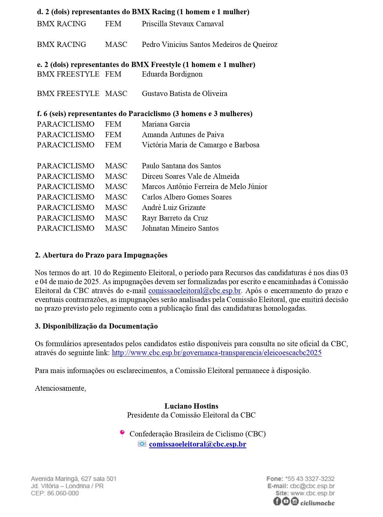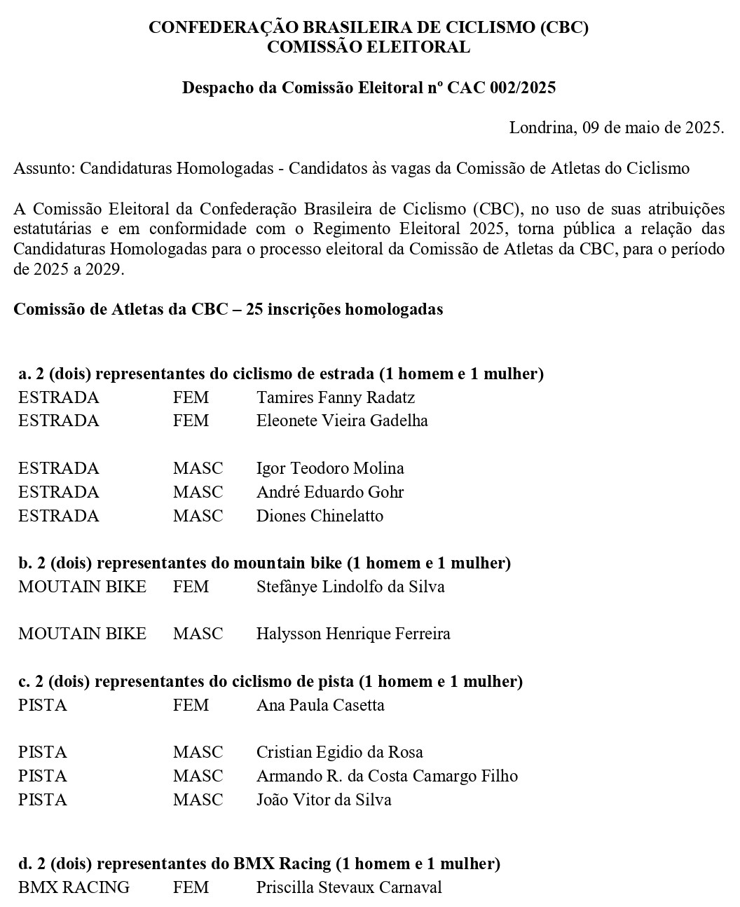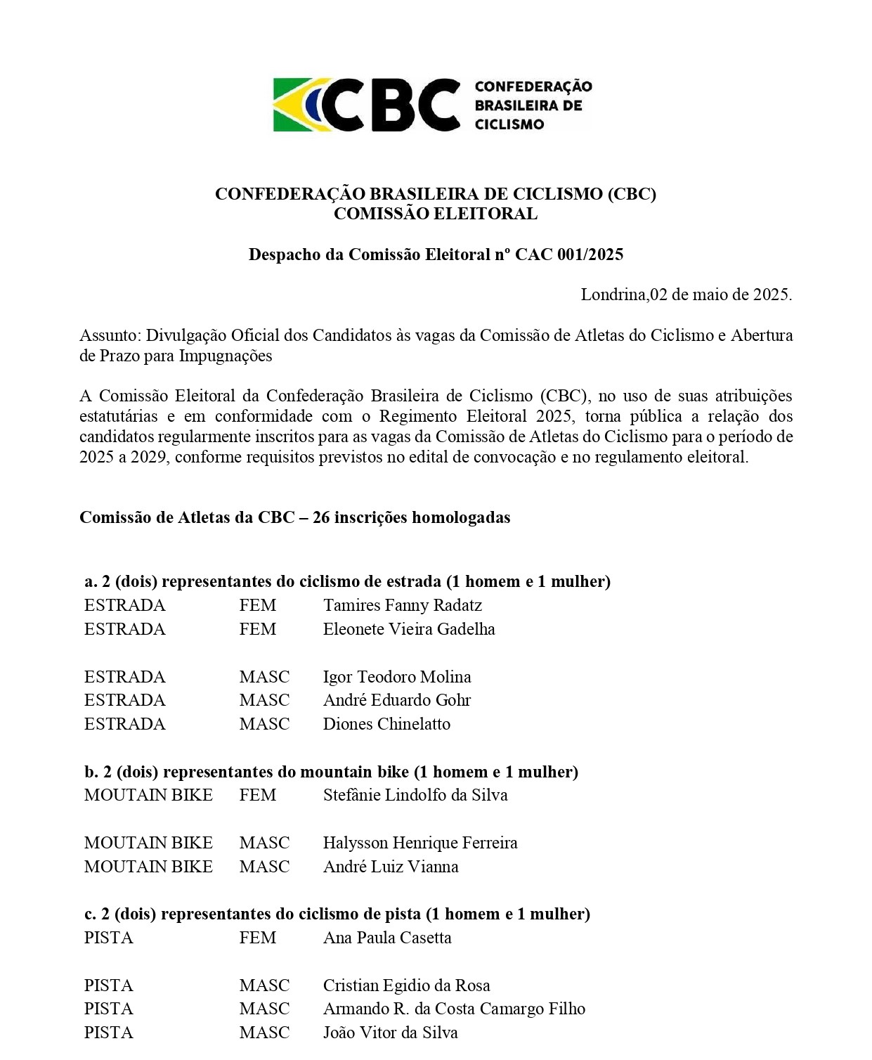 A Comissão Eleitoral da Confederação Brasileira de Ciclismo (CBC), no uso de suas atribuições estatutárias e em conformidade com o Regimento Eleitoral 2025, torna pública a relação dos candidatos regularmente inscritos para as vagas da Comissão de Atletas do Ciclismo para o período de 2025 a 2029, conforme requisitos previstos no edital de convocação e no regulamento eleitoral.