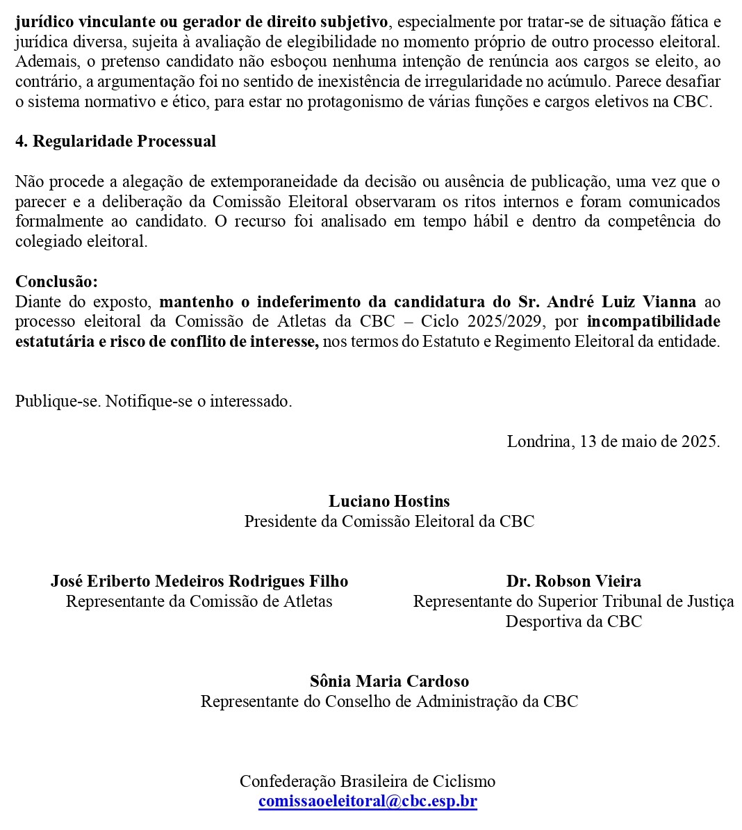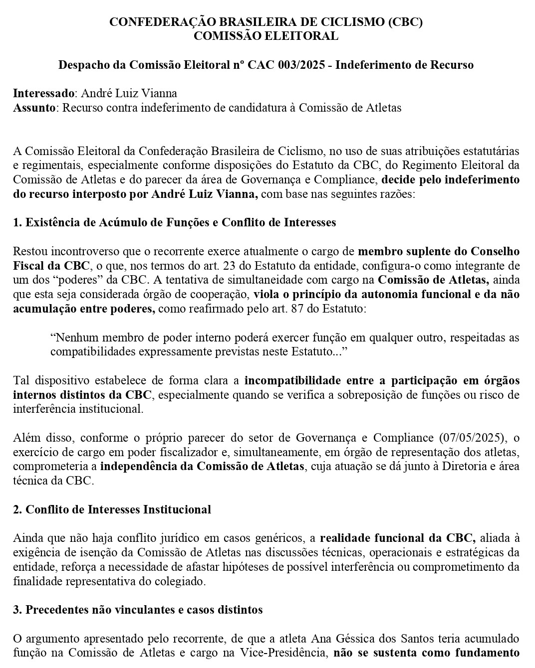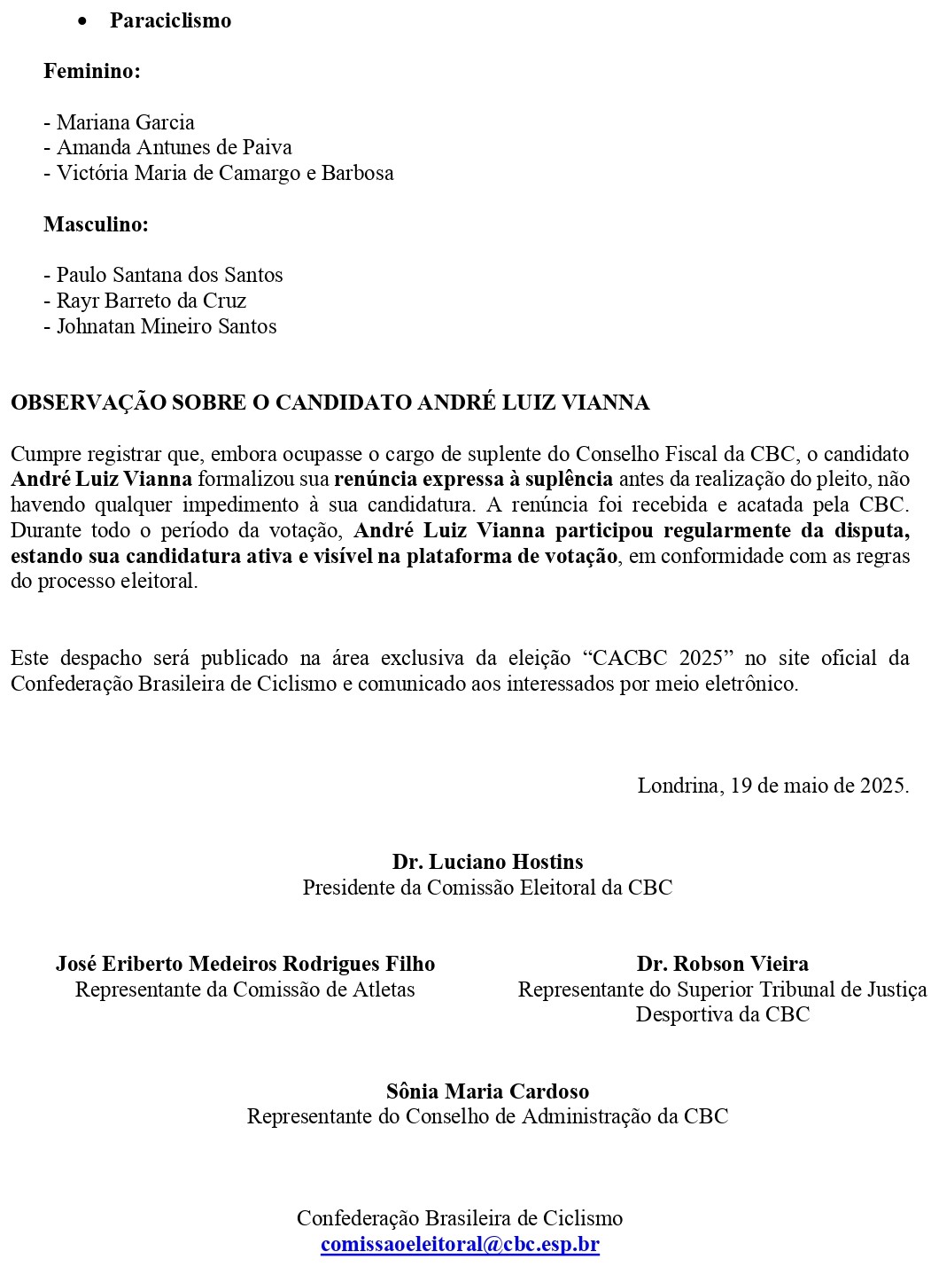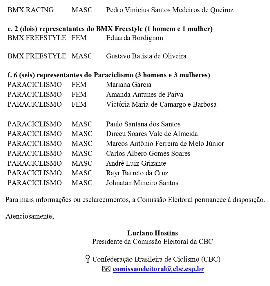 A Comissão Eleitoral da Confederação Brasileira de Ciclismo (CBC), no uso de suas atribuições estatutárias e em conformidade com o Regimento Eleitoral 2025, torna pública a relação dos candidatos regularmente inscritos para as vagas da Comissão de Atletas do Ciclismo para o período de 2025 a 2029, conforme requisitos previstos no edital de convocação e no regulamento eleitoral.