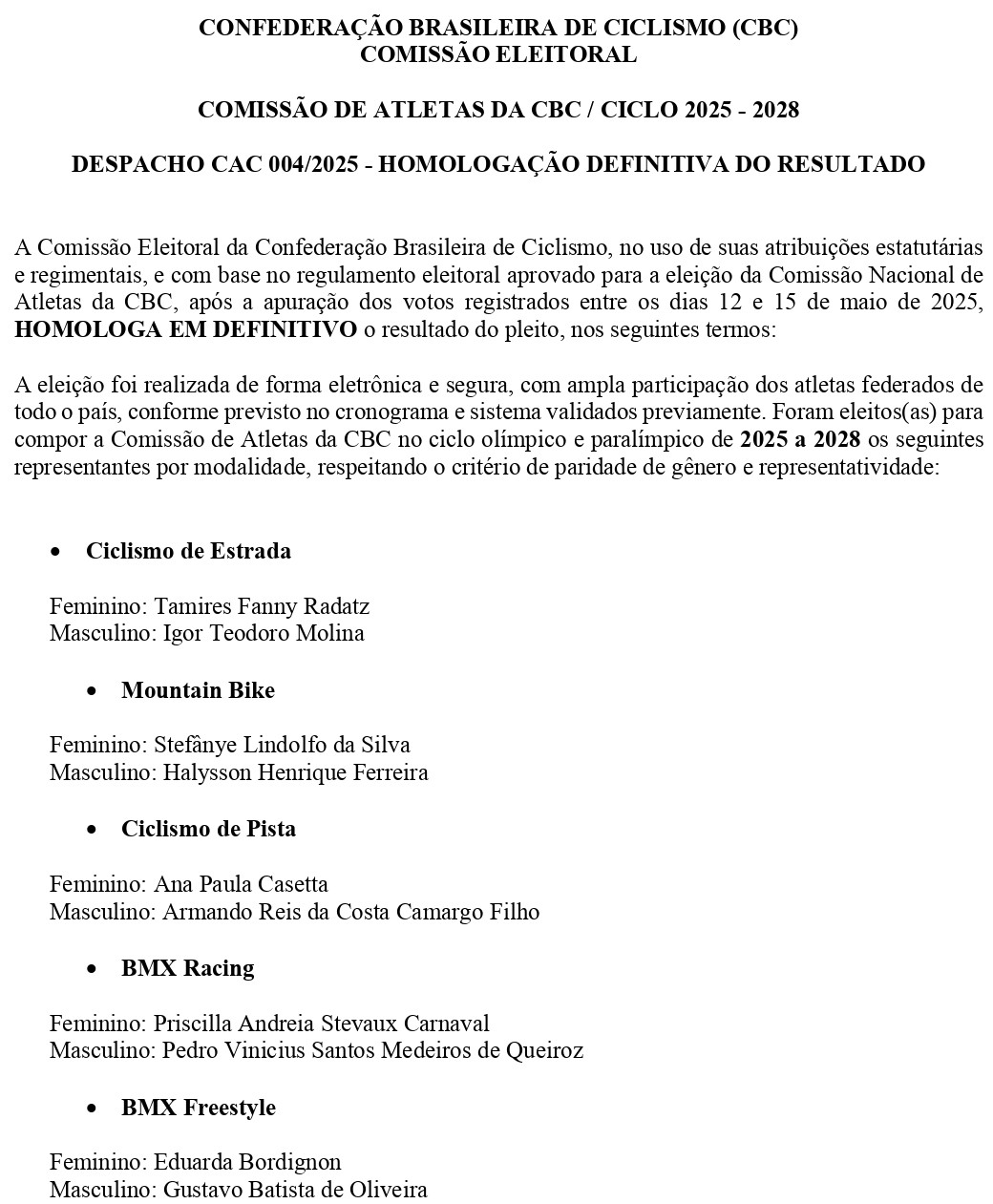 A Confederação Brasileira de Ciclismo (CBC), vem tornar público os resultados dos votos das eleições da Comissão de Atletas do Ciclismo (CAC) para o periodo de 2025 a 2029.