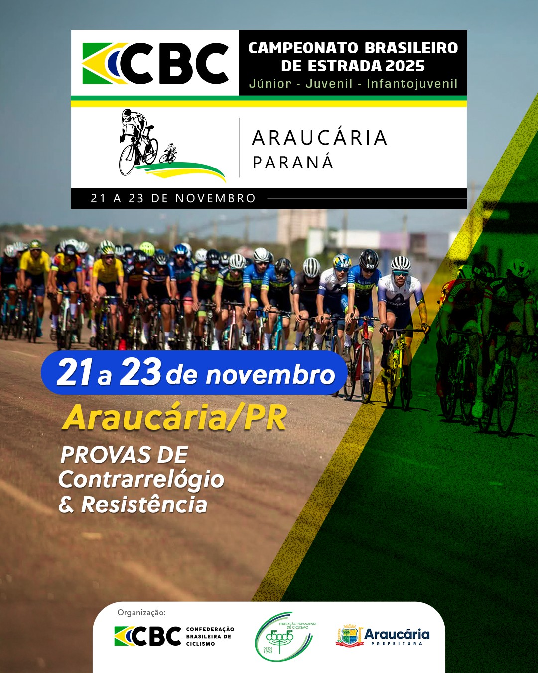 O Campeonato Brasileiro de Ciclismo de Estrada e Contrarrelógio é o evento mais importante da temporada nacional e será realizado entre os dias 21 a 23 de novembro de 2025 na cidade de Araucaria, Estado do Parana. Será constituído pelas provas de Estrada (Resistência) e Contrarrelógio para as categorias Infanto-Juvenil, Juvenil e Junior Masculino e Feminino.