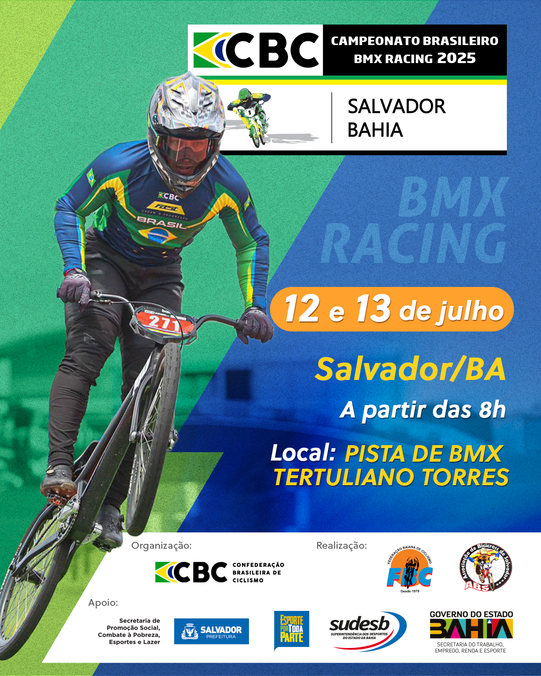 A Confederação Brasileira de Ciclismo, Federação Baiana de Ciclismo, Associação de Bicicross de Salvador, Prefeitura Municipal de Salvador e do Governo do Estado através da Sudesb (Superintendência dos Desportos do Estado da Bahia) têm o prazer de convidar a todos a participarem do "CAMPEONATO BRASILEIRO DE BMX RACING 2025", que acontecerá na cidade de Salvador/BA, nos dias 12 e 13 de julho de 2025, na Pista de BMX Tertuliano Torres.