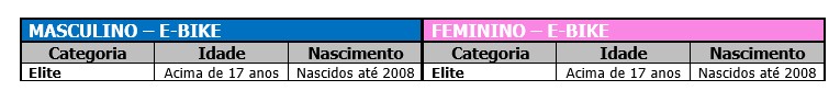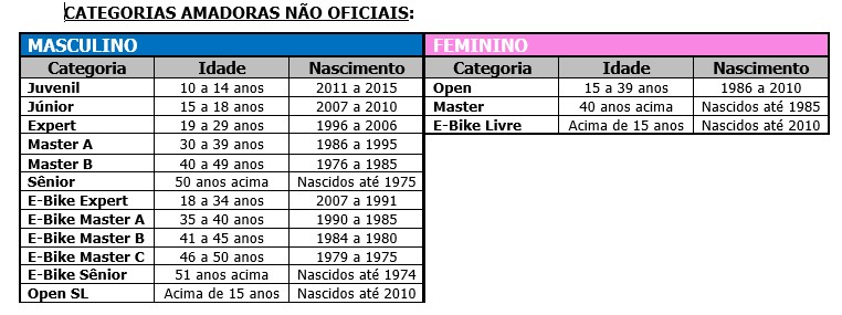 - Categorias oficiais do CAMPEONATO BRASILEIRO DE MOUNTAIN BIKE ENDURO 2025, para as provas de Enduro - EDR/EDR-E, são as seguintes
