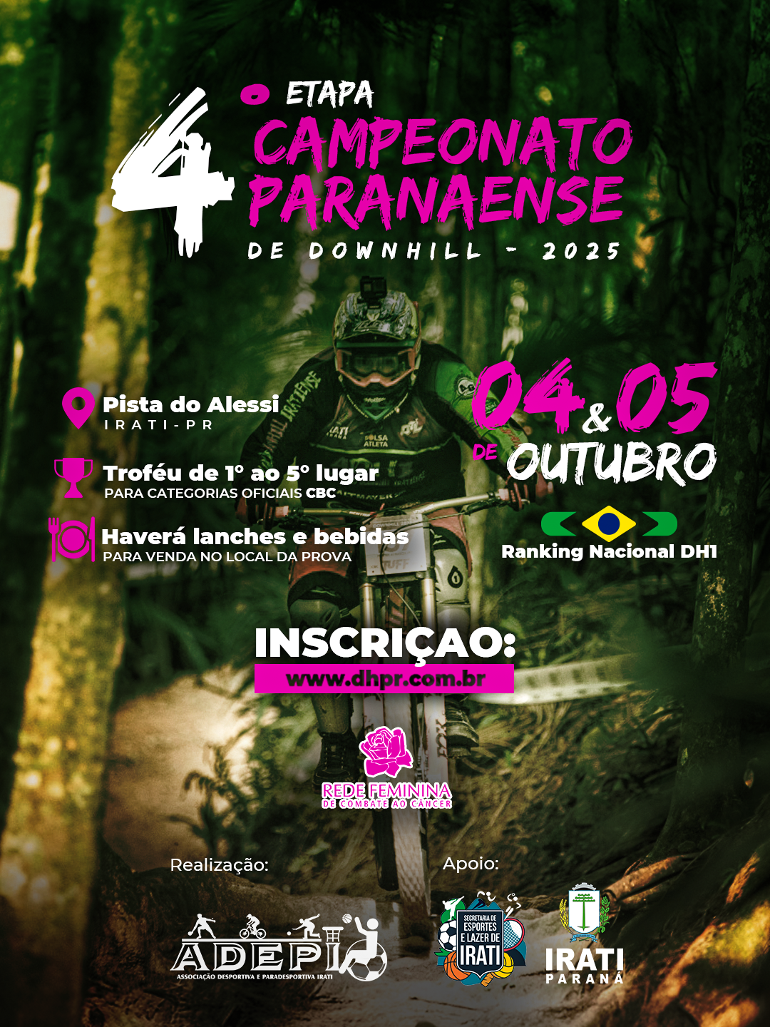 - Nos dias 04 e 05 de Outubro 2025, Acontecerá na cidade de Irati - PR a 4ª Etapa do Campeonato Paranaense de Downhill. Serão 2 dias de muito rolê e diversão com Resgate e ambulância no local. Não fique fora desta!